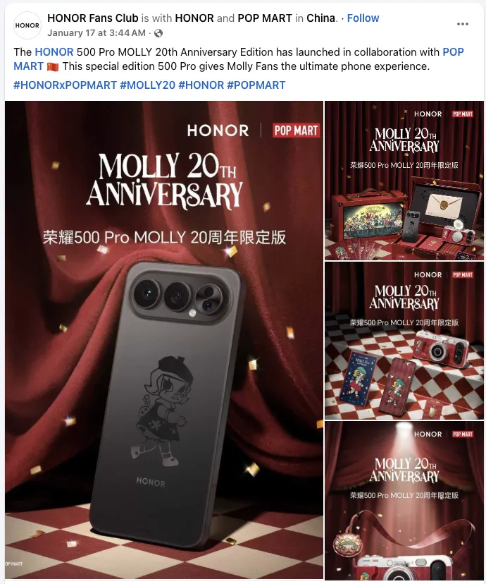 东南亚正逐步成为荣耀新的战略重点。一方面,当地制造与渠道能力逐渐成熟;另一方面,对智能手机需求也不断增长。荣耀也开始尝试更本地化的营销方式——与在东南亚爆火的泡泡玛特合作,推出绑定 Molly IP 的 Magic 500 系列,并于 2026 年 1 月底上市。这种跨圈层联名,体现了荣耀在东南亚市场对年轻消费群体的主动靠近。