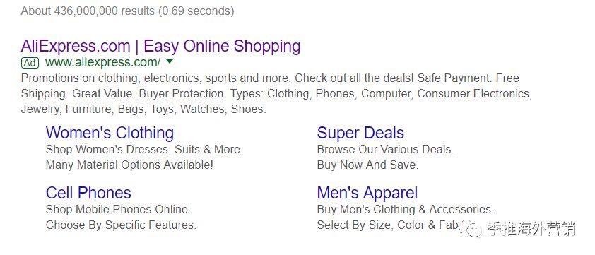 例如,Aliexpress 的品牌广告:网站的性质、功能、定位、类目展示得非常清楚;展现方式上就直接比常规的广告 多出一个广告位;