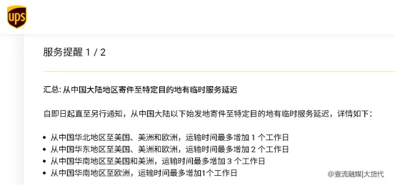 目前,基于空运物流的时效与费用变化,除UPS、FedEx外,还有许多下游的物流货代亦是有相同的通知、预警发出。