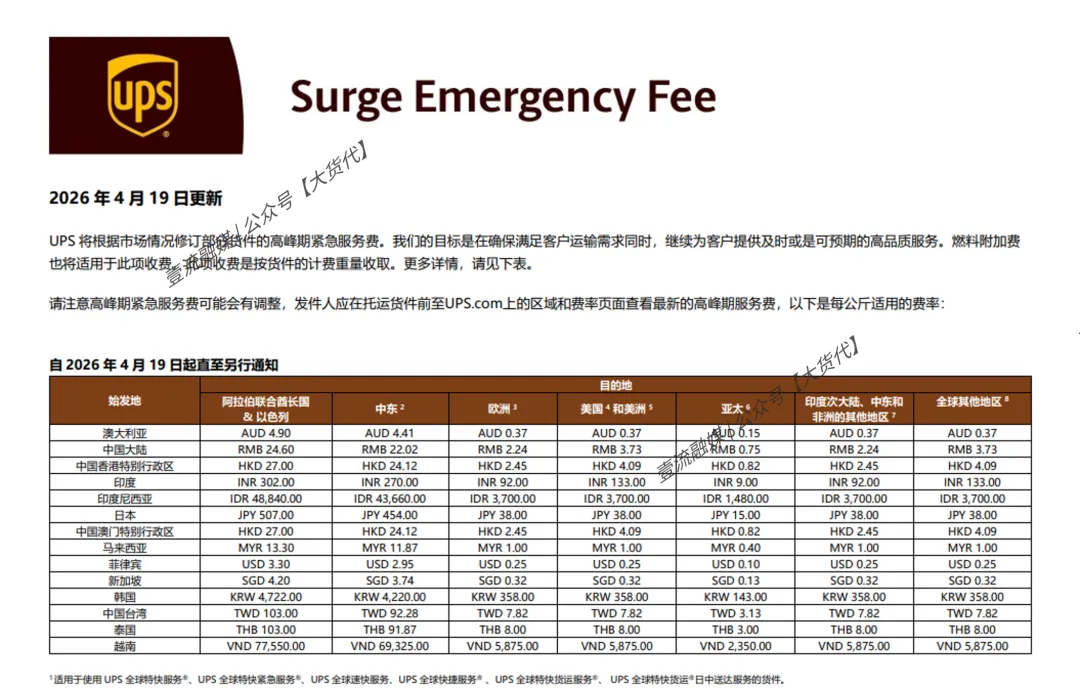 虽然本周(4月20号起)略微回落至47.5%,但这也是因为UPS在4月19号已经先宣布了将调整“高峰期紧急服务费”!
