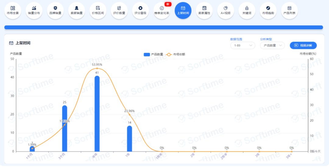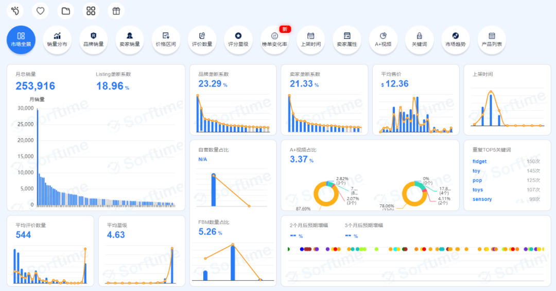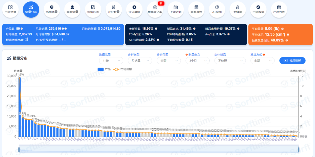 ④垄断程度:一般情况下,该列表作为样本来检查市场的垄断程度。插件sorftime可以从链接、品牌和卖家三个维度清晰地告诉我们市场的垄断情况。我们还可以看到不同价格范围、评论数量、上市时间和销售之间的关系。