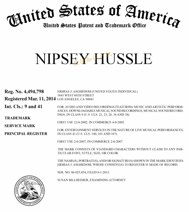 这是一个说唱歌手品牌商标维权案件,歌手是Nipsey Hussle。Nipsey Hussle是一位美国黑人说唱歌手、活动家、企业家,在洛杉矶自己的服装店外与粉丝见面,随后遭遇枪击。身中多枪,在送往医院的途中宣告死亡,遗产由其兄弟Samiel Asghedom管理。