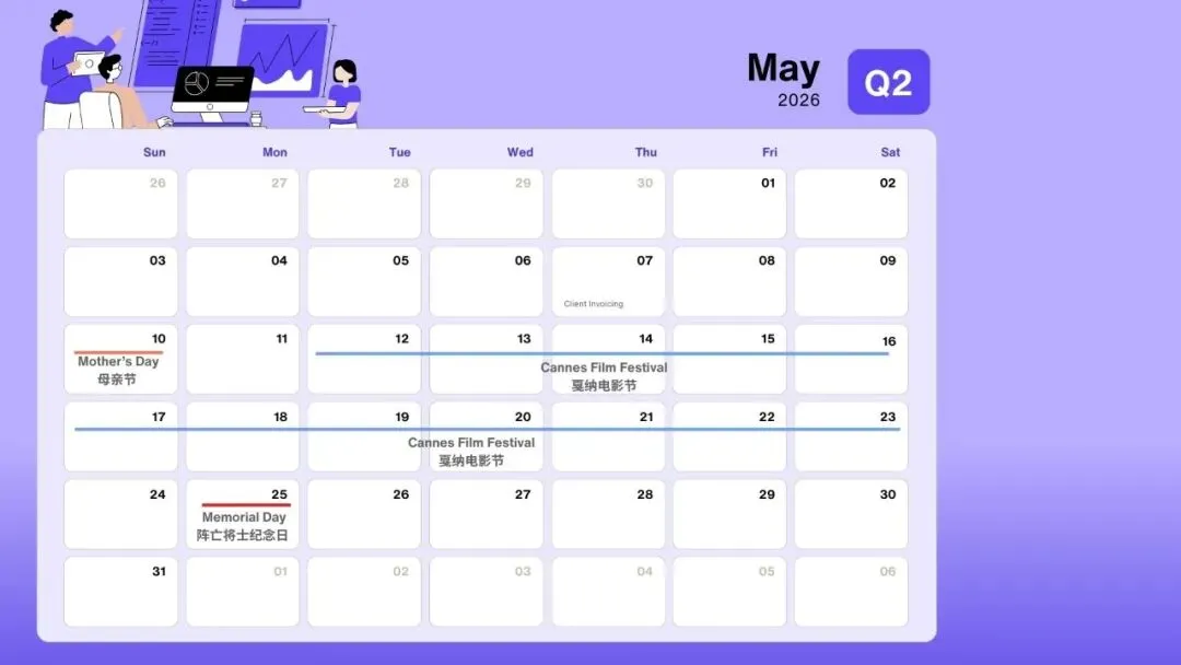节日洞察:戛纳是全球影视顶级节点,2025 年超 3000 家影视机构参会,欧美娱乐博主相关话题曝光量超 50 亿次;去年某国产折叠屏品牌借 “戛纳片场拍摄” 露出,欧洲市场销量 1 个月内涨 150%,高端美妆、服饰品牌借戛纳红毯曝光的品牌,海外知名度平均提升 200%。