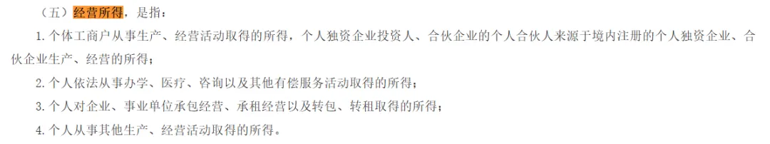 事实上,以上担忧是完全没必要的。《中华人民共和国个人所得税法实施条例》第六条第五项对“经营所得”作出了具体界定,具体如下图所示: