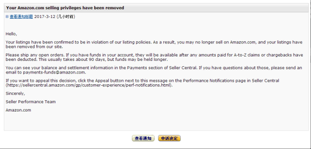 老司机们心里在淌血啊,精心做起来的账号毫无预兆的就这么死了?不过幸好亚马逊给出了要求,还能申诉。