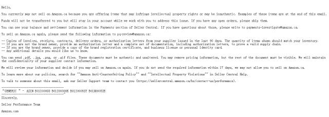 年初,一堆账号因为“Generic”产品侵权问题,而导致被封,先是加拿大站不能销售,紧接着其他站点也陆续收到邮件,被亚马逊移除了销售权限。