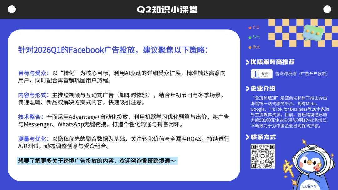 Q2:Facebook广告投放全攻略,涵盖AI受众精准触达、短视频创意打造、ROAS优化等核心技巧;
