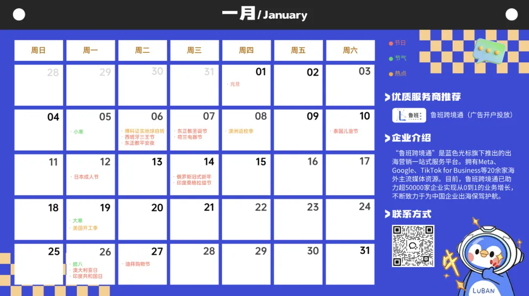 基于此,由蓝色光标旗下鲁班跨境通牵头出品,联合20余家跨境头部服务商共同打造的「2026全球出海营销日历」今日正式上线。这份日历聚焦出海全链路需求,整合全年营销节点、优质服务资源与实战干货,为中国出海企业提供可落地的运营参考,现免费开放领取。