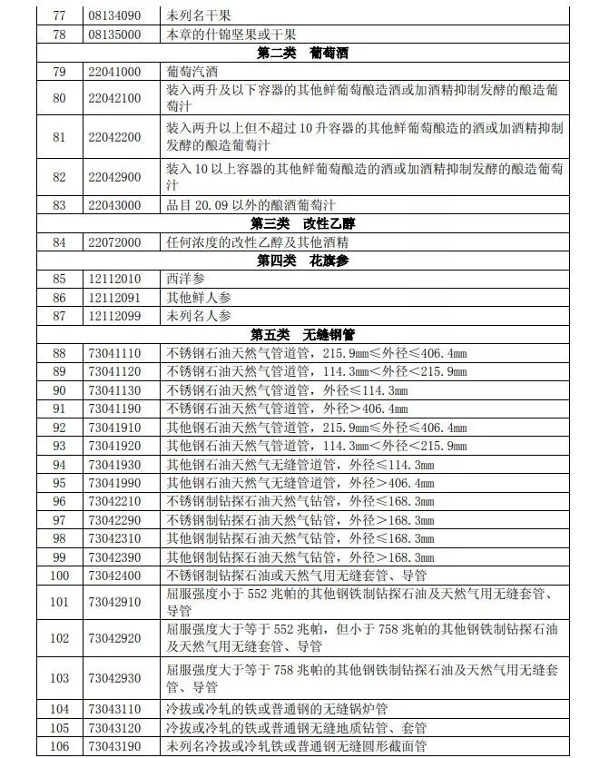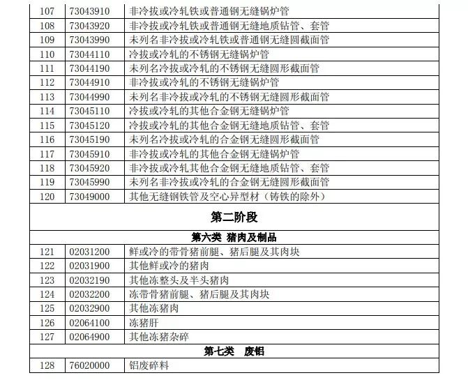 第一部分共计120个税项,涉及美对华9.77亿美元出口,包括鲜水果、干果及坚果制品、葡萄酒、改性乙醇、花旗参、无缝钢管等产品,拟加征15%的关税。第二部分共计8个税项,涉及美对华19.92亿美元出口,包括猪肉及制品、回收铝等产品,拟加征25%的关税。