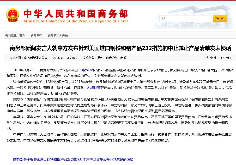 据商务部网站,3月23日,商务部发布了针对美国进口钢铁和铝产品232措施的中止减让产品清单并征求公众意见,拟对自美进口部分产品加征关税,以平衡因美国对进口钢铁和铝产品加征关税给中方利益造成的损失。