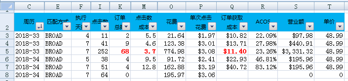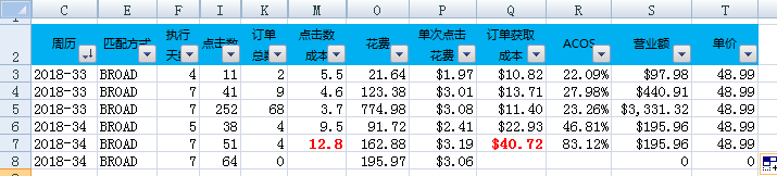 2,看Excel的第7行。该关键词(已隐藏)做满了一周7天的广告,产生51次点击,4个订单。平均每12.8次点击可以获取一个订单。当周广告花费162.88美金,平均每次点击单价是3.19美金,×12.8次=40.72美金=每个订单的获取成本!