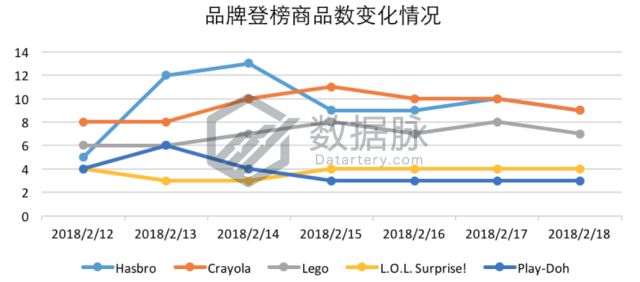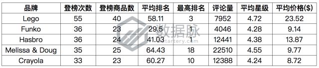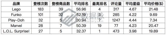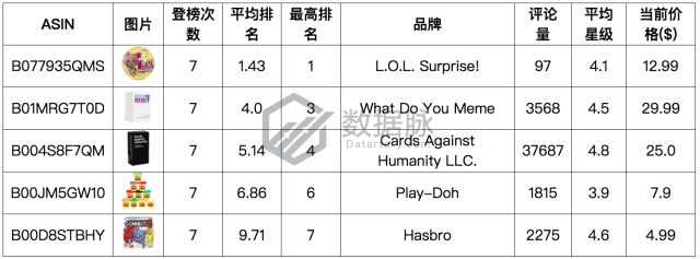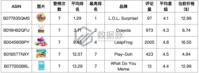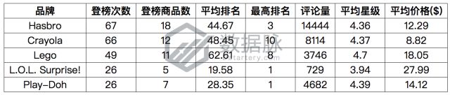品牌Play-Doh的橡皮泥工具套装三度进入榜单前十,以平均排名12.57位列综合排名第四位;