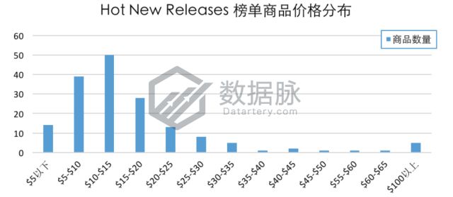 在Toys & Games品类Hot New Releases榜单分析中,商品最高价$199.32,最低价$1.5,平均价格$16.12。骆探长(shujumai.com)发现,上榜商品的平均价格明显下降,较多商品的价格位于$10.00-$15.00区间以内,占比28.90%,该区间商品数量有所增多;有22.54%的商品价格位于$5.00-$10.00;并且,在Hot New Releases榜单中,有5款商品价格高于$100,占比达2.89%。