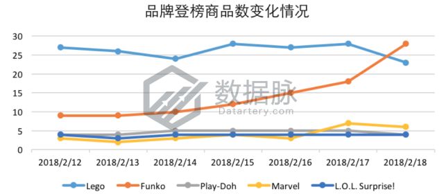 在Toys & Games品类的Hot New Releases榜单分析中,骆探长(shujumai.com)发现,品牌Lego的表现令人震惊,每日至少登榜23款商品,登榜了39款商品,凭借登榜183次的优异表现,以绝对实力击败其他竞争品牌,夺得品牌排名的王冠;玩偶品牌Funko同样表现不俗的品牌实力,每日登榜商品数一路猛涨,共有32款商品登榜,以登榜101次的不俗表现,暂居品牌排名第二位;橡皮泥玩具品牌Play-Doh有5款商品登榜,以登榜32次位列品牌排名第三位;品牌Marvel共有7款商品登榜,累计登榜28次,位居品牌排名第四;品牌L.O.L. Surprise!共登榜5款商品,凭借登榜27次,位居品牌排名第五位。
