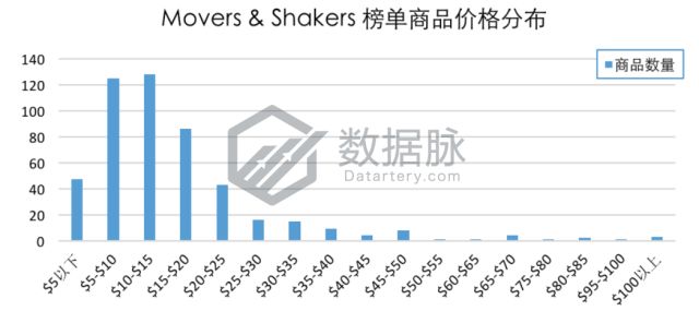 在Toys & Games品类Movers & Shakers榜单分析中,商品最高价$279.99,最低价$0.99,平均价格$16.58。骆探长(shujumai.com)发现,与上期分析相比,平均价格稍有上涨;其中价格位于$10.00-$15.00区间内的商品数量较多,占比达25.70%;另有25.10%的商品其价格在$5.00-$10.00以内;此外,仅有3款商品的价格在$100以上,占比0.60%。
