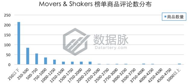 在登榜 Toys & Games 品类Movers & Shakers榜单的商品中,单个商品拥有的最大评论数为37687.0,最小评论数为0.0条,平均评论数742.77条,评论平均星级4.38星。在上榜商品中,有42.97%的商品评论数在250条以下,该区间商品大量增加;有16.87%的商品评论数位于250-500区间内;另有4款商品的评论数超过5000条,占比为0.80%。骆探长(shujumai.com)发现,相比上期分析,本期上榜商品的平均评论数小幅度下降,平均星级仅增加0.01星。