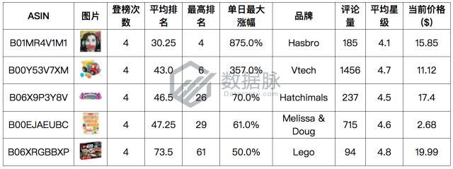 骆探长(shujumai.com)发现,在Toys & Games品类的Movers & Shakers榜单分析中,综合排名前五的商品均登榜4次;品牌Hasbro的听力游戏套装以平均排名30.25位居综合排名首位,其单日最大涨幅高达875.0%,骆探长(shujumai.com)发现,该商品目前评论量为185条,平均星级为4.1星,该商品后续表现值得期待;