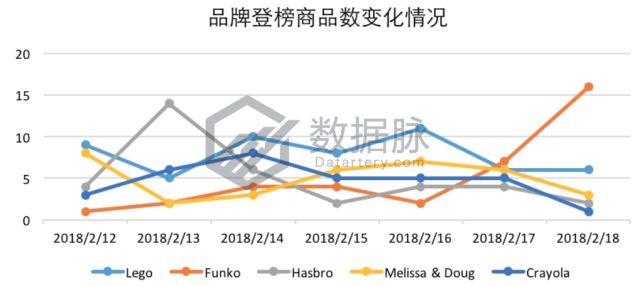 2018年2月12日至2018年2月18日共有644款商品登榜亚马逊Toys & Games品类的相关榜单,其中涉及品牌数267个。截至2018年2月18日,登榜商品总评论数达421542条,平均星级4.37星。