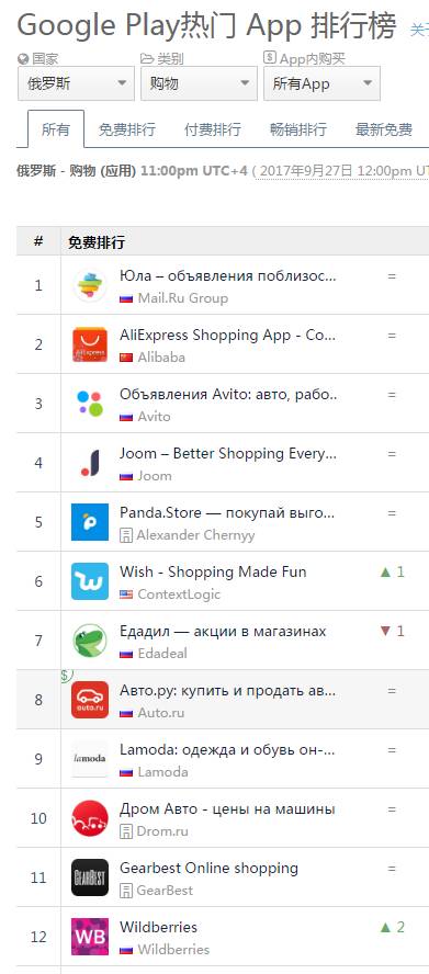 而俄罗斯Google Play排名却与iOS排名略有区别。速卖通旗下的AliExpress Shopping App排名为第二,Joom、Wish和Lamoda的排名则分别为第四、第六和第九。
