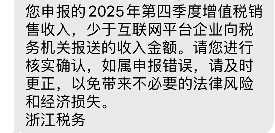 就在2月5日一大早,浙江、安徽、广东、江苏这些跨境电商大省的卖家,陆续在群里晒出了税务局发来的 风险提示 短信。