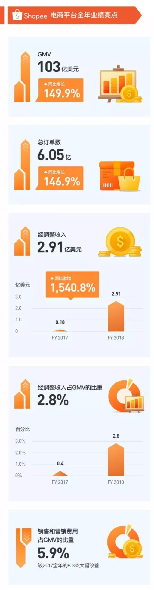 2018年全年调整后Shopee收入达到2.907亿美元,同比增长1540.8%。