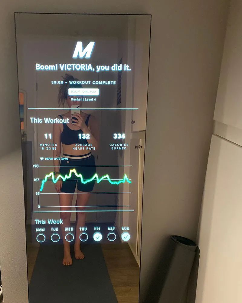 于是,她开始琢磨如何在她不在工作室当教练的时候,她利用亚马逊平板电脑,一块玻璃镜子和一个树莓派(Raspberry Pi)微型电脑处理器,把她之前教的课程的录像,放到镜子上,让学员在锻炼的时候,可以看着镜子里显示器她的演示动作,用视频的方式,让学员照着镜子,一面锻炼,一面继续听着她的讲解继续锻炼。这个实验成功让她思路迅速打开,从传统的继续开连锁店的模式,索性让学员买她设计的镜子带回家,对着她准备好的课程,同时还可以在镜子上的摄像头,与学员不断互动的模式。