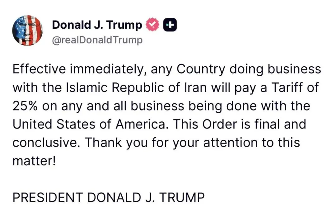 当地时间1月12日,美国总统特朗普在其社交媒体“真实社交”发文称,即日起,任何与伊朗伊斯兰共和国开展商业往来的国家,在与美国进行的任何商业活动中都将被征收25%的关税。
