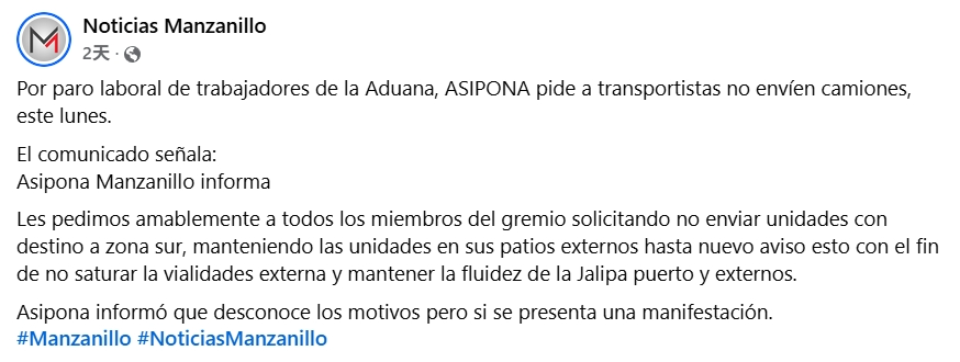 据Noticias Manzanillo消息,目前墨西哥海关正因“大规模检查”“海关官员罢工”等一系列事件困扰,清关时效被无限拉长,并造成极其严重的货物延误情况!
