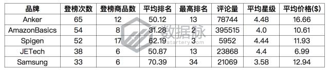 根据上周Movers & Shakers榜单上各个品牌下商品的登榜次数,我们对登榜的品牌进行了排序,其中排名靠前的五个品牌如下所示: