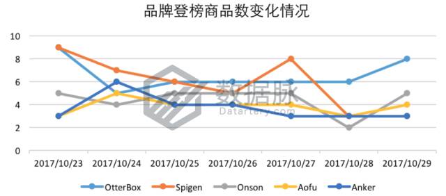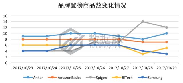 可以看到,在上周Cell Phones & Accessories品类的Best Sellers榜单中,品牌Anker凭借稳定的榜单发挥,再次以七天总登榜次数65次的优秀战绩位列品牌综合排名第一;紧随其后的是其老对手AmazonBasics, 该品牌在上周维持着每日登榜7款以上商品的良好表现,夺得总登榜次数54次,位列品牌综合排名第二。此外骆探长(shujumai.com)发现,手机壳品牌Spigen在上周的榜单竞争中后期发力,自10月25日开始每日上榜的商品数量逐日稳步上升,在一周中共夺下52次登榜,位列品牌综合排名第三。