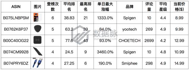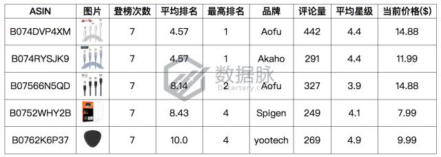 可以看到,在上周Cell Phones & Accessories品类的Hot New Releases榜单中,手机数据线产品继续独领风骚。三款数据线产品分别占领了综合排名前三——其中,在上期分析中表现出色的两款品牌为Aofu的数据线产品在该周中表 现更为突出,分别以平均排名4.57与8.14的成绩位列综合排名第一与第三名;