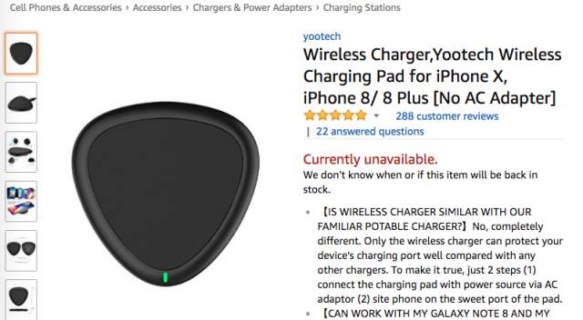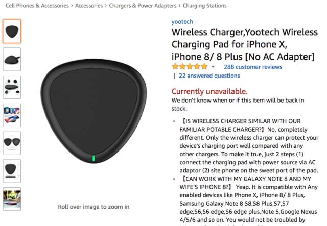 同时骆探长(shujumai.com)注意到,目前两款产品都只有10条买家评论,随着iPhone X销售热度的上升,产品的后续市场空间值得关注。此外,在上周Cell Phones & Accessories品类Movers & Shakers榜单表现较好的五款商品中,我们还发现了两款无线充电器产品,其中上文曾经提及的品牌yootech无线充电器产品在上周5次进榜,位列综合排名第三,而另 一款来自品牌CHOETECH无线充电器产品同样在上周进榜5次,以77.60的平均排名成绩位居综合排名第四。