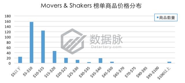 上周Cell Phones & Accessories品类Movers & Shakers榜单商品最高价$499.95,最低价$0.01,平均价格$17.76。骆探长(shujumai.com)发现,其中33.91%的商品价格位 于$5.00-$10.00区间内,另有26.78%的商品价格位于$10.00-$15.00区间;此外,有6款商品价格大于$100.00,占上榜商品总数的1.30%。相比于上期分析,该周进榜商品的平均价格略有提升。