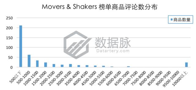 在上周登榜Cell Phones & Accessories品类Movers & Shakers榜单的商品中,单个商品拥有的最大评论数为49451.0,最小评论数为0.0条,平均评论数2384.69条,评论平均星级4.35星。其 中,45.57%的上榜商品评论数在500条以下,另有13.39%的商品评论数位于500-1000条之间。此外,有24款商品评论数评论数破万,占总上榜 商品数的5.18%。骆探长(shujumai.com)发现,相比于上期分析,该周上榜商品评论数显著回落,冲刺BSR排名的更多机会再次回到高质量的新品手中。