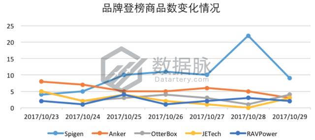 可以看到,在上周Cell Phones & Accessories品类的Movers & Shakers榜单中,手机壳品牌Spigen凭借10月28日单日登榜22款商品的突出表现,获得一周总登榜次数71次,击败同榜竞争的其他品牌,位列品牌综合排名首 位。此外,品牌Anker、OtterBox、JETech在上周也有不错的榜单发挥,分别位列品牌综合排名第二、三、四位。