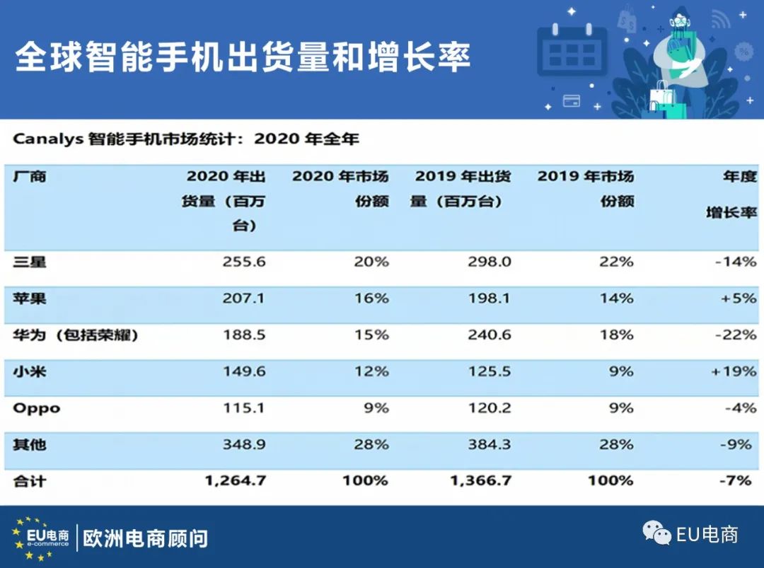 据Canalys最新报告指出,2020年第四季度,全球智能手机出货量达到3.596亿部,同比小幅下降2%。其中苹果出货量排名第一,在单个季度的iPhone出货量创历史新高,达8180万台,比去年同期增长4%。三星排名第二,出货量为6200万台,骤降12%。小米、Oppo和Vivo跻身前五名,各自从处于困境的华为(包括荣耀)处抢占了份额。小米出货量猛增31%至4340万台,Oppo出货量增长15%至3470万台,Vivo出货量增长14%至3210万台。2020年全年,三星继续保持全球领先地位,占有20%的全球市场份额,苹果位居第二,华为(包括荣耀)仍跻身三强。