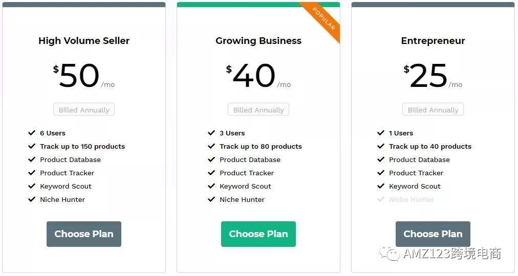 Jungle Scout提供Web App和Chrome插件。前者是付费订阅,有三个可用计划:Entrepreneur(25美元/月)、Growing Business(40美元/月)和High Volume Seller(50美元/月)。不同之处在于可以使用的用户数量,套餐越高级,可以在帐户中添加的用户以及要跟踪的产品数量就越多。此外,Growing Business和High Volume Seller计划还包括了Niche Hunter功能。