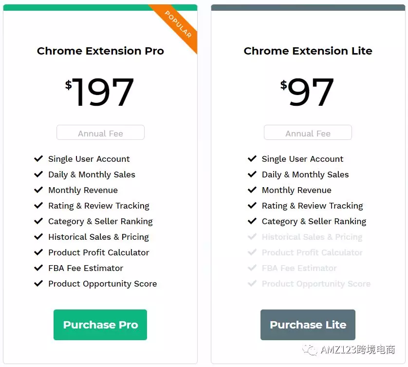如果要使用JS的Google Chrome插件,需要支付年费。Chrome Extension Lite每年97美元,包含每月销售额和收入、评分和评价跟踪等信息。Pro版本每年197美元,包括Lite版本中的所有内容以及历史销售数据和价格、产品利润计算器、FBA费用估算器等。