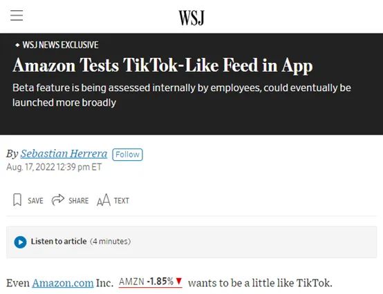 而亚马逊也并非第一个模仿TIKTOK的平台。诸如Facebook母公司Meta以及谷歌母公司Alphabet等大科技公司都在试图通过短视频和丰富的内容流来提高用户参与度。如今亚马逊也加入了这一行列,开始模仿TikTok。