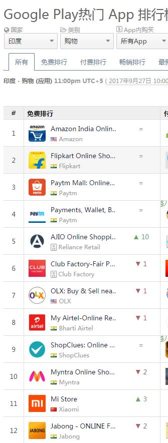 Google Play排名方面,排名前5名依次为Amazon、Flipkart、Paytm Mall、Paytm的Payments软件以及AJIO。值得注意的是,小米商城App排至Google Play排名的第11。