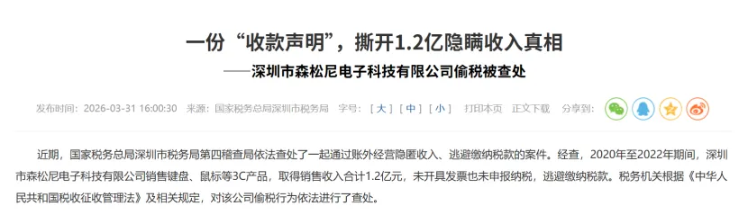 3月31日,深圳市税务局重磅通报:20年行业老牌——深圳市森松尼电子科技有限公司,因账外经营、隐匿收入1.2亿元,被追缴税款+罚款合计2818.56万元,并移送公安机关追究刑事责任。