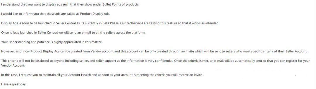 邮件中说到:目前亚马逊PD 广告这一功能还处在测试阶段,但是很快就会在卖家中心上线,一旦全面上线,亚马逊会通过后台向所有卖家发送邮件通知。