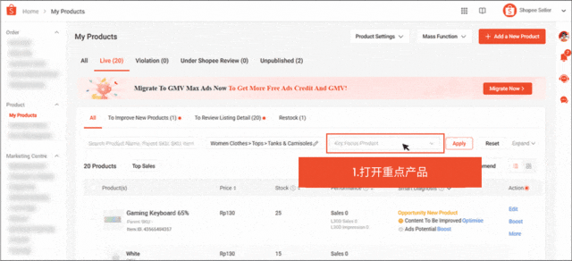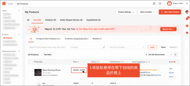 通过智能诊断,卖家还可以根据推荐优化商品列表,推荐可能包括提升广告、补货、参与竞价程序或链接到 Shopee 标准产品 (SSP)。