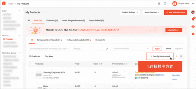 搜索结果默认会根据 Shopee 的推荐进行排序。您也可以选择按日期排序,通过选择按最近排序,将显示您最新上传的产品。
