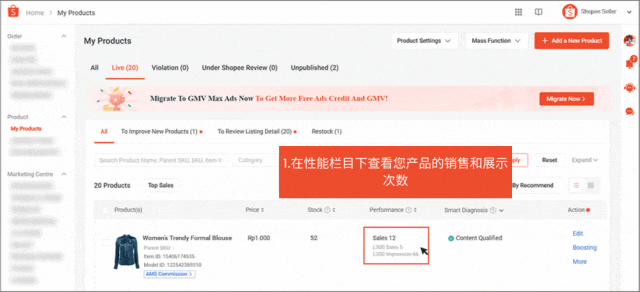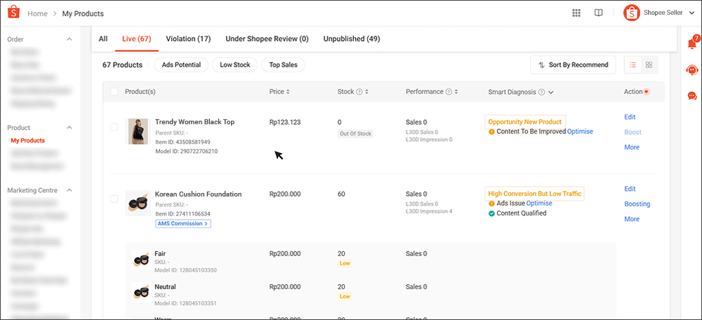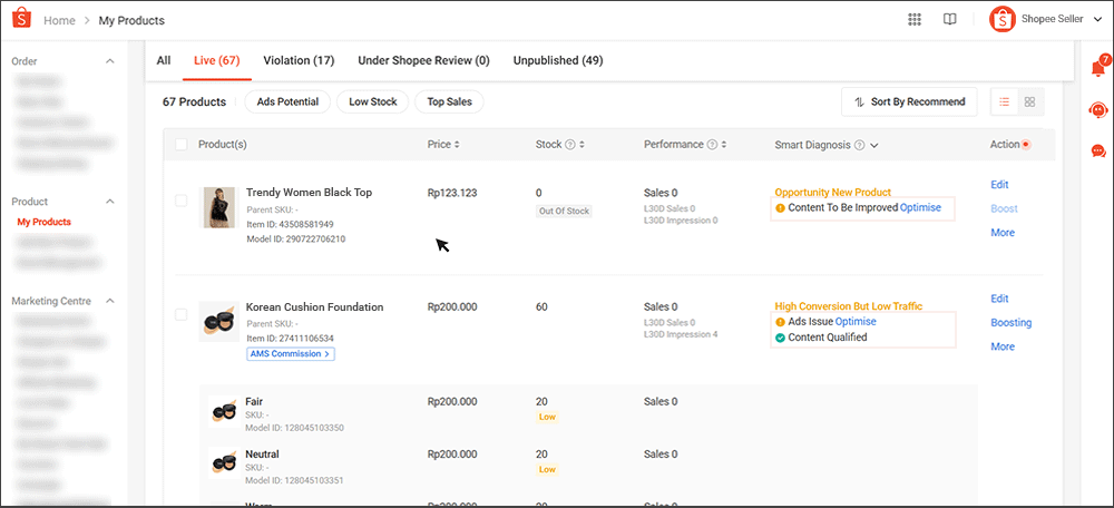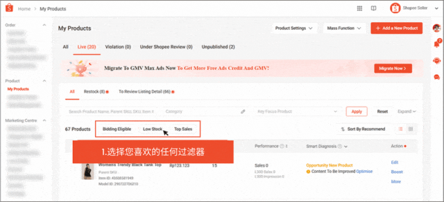 卖家也可以通过 Shopee 应用利用智能诊断功能。快速过滤器和详细过滤器使卖家能够快速排序产品。它还显示每个产品的性能和推荐的卖家行动,以帮助优化商品列表并提升可见性。