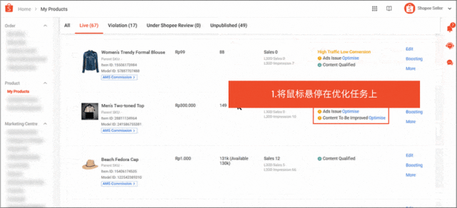 -内容质量:Shopee 将评估您的商品列表内容质量,并通知您哪些商品需要优化。