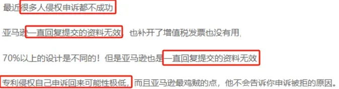需要注意的是,很多卖家都反馈专利不侵权申诉难以成功,经常会陷入“按要求提交资料-亚马逊回复资料无效”的死循环。