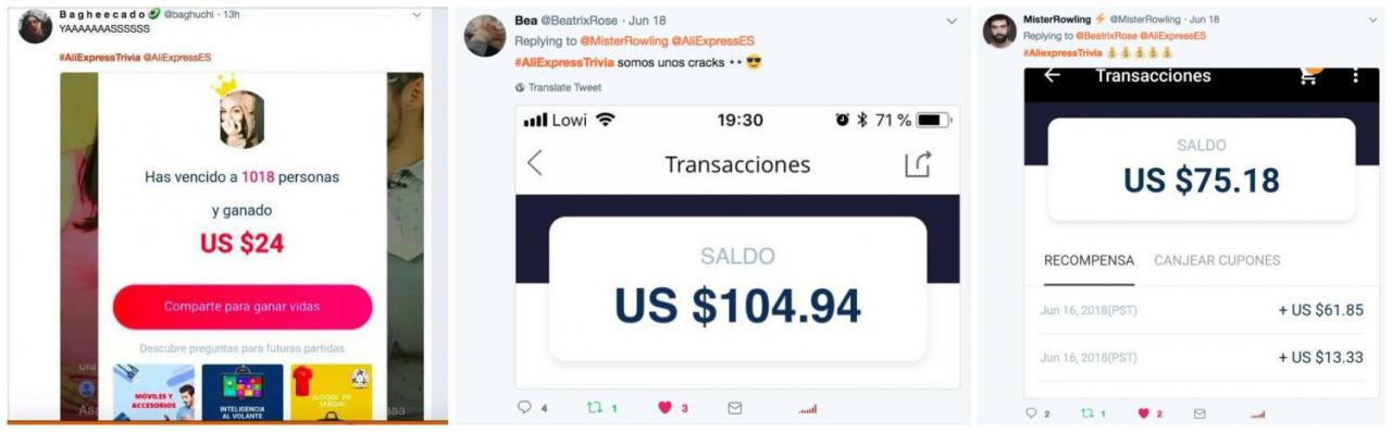在世界杯开幕当天,速卖通重金在俄罗斯及西班牙C端推出直播答题游戏 “AliExpress Trivia(点题成金)”,其中在俄罗斯的活动奖金最高达1700万卢布(约合人民币175万),西班牙奖金达到80000欧元(约合人民币60万)。俄罗斯的第一个大奖已经在6月14日诞生。