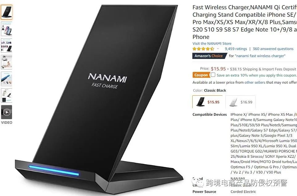 下面这款手机无线充,长得比较普通。目前它是亚马逊美国站的Amazon's Choice,留评9459,售价15.95美元: