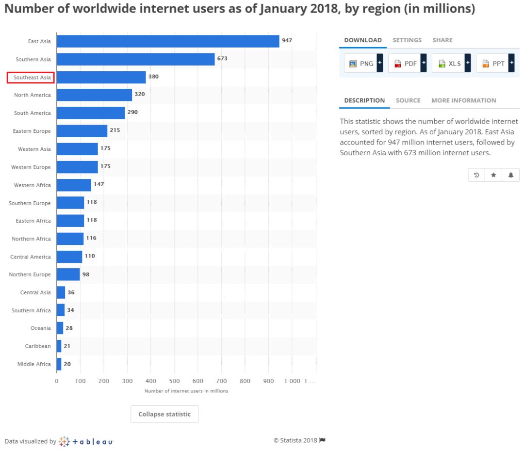1)在互联网用户上,东南亚地区具有极为突出的数量优势。在全球范围内,到2018年1月,东南亚地区是全球第三大互联网用户数最多的地区,仅次于东亚地区和南亚地区。